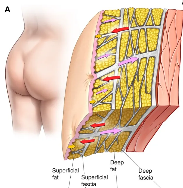 Целлюлит — это не просто «застоявшийся жир», а нарушение архитектуры кожи и подкожной ткани. В наиболее подверженных зонах — бёдра, ягодицы, живот — под кожей находятся слои жировой ткани и фиброзные коллагеновые перегородки (септы), соединяющие кожу с мышцами. Когда более короткие и менее устойчивые перегородки ослабевают, жировые дольки начинают выпирать вверх, в то время как более плотные септы остаются фиксированными и тянут кожу вниз. В результате появляется характерная бугристость — «апельсиновая корка».