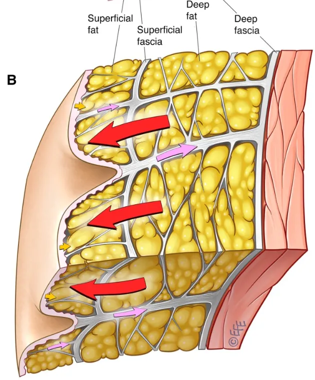 Именно поэтому целлюлит — это прежде всего структурная проблема, а не просто вопрос веса. Ключевые анатомические и клинические исследования показывают, что выпячивание жира — это вторичный процесс: основная причина — дисбаланс механических сил между соединительнотканными перегородками, жировыми слоями и дермой. Даже у стройных людей может быть целлюлит — а резкое похудение иногда даже усиливает его проявления из-за снижения тонуса кожи без восстановления структуры перегородок.